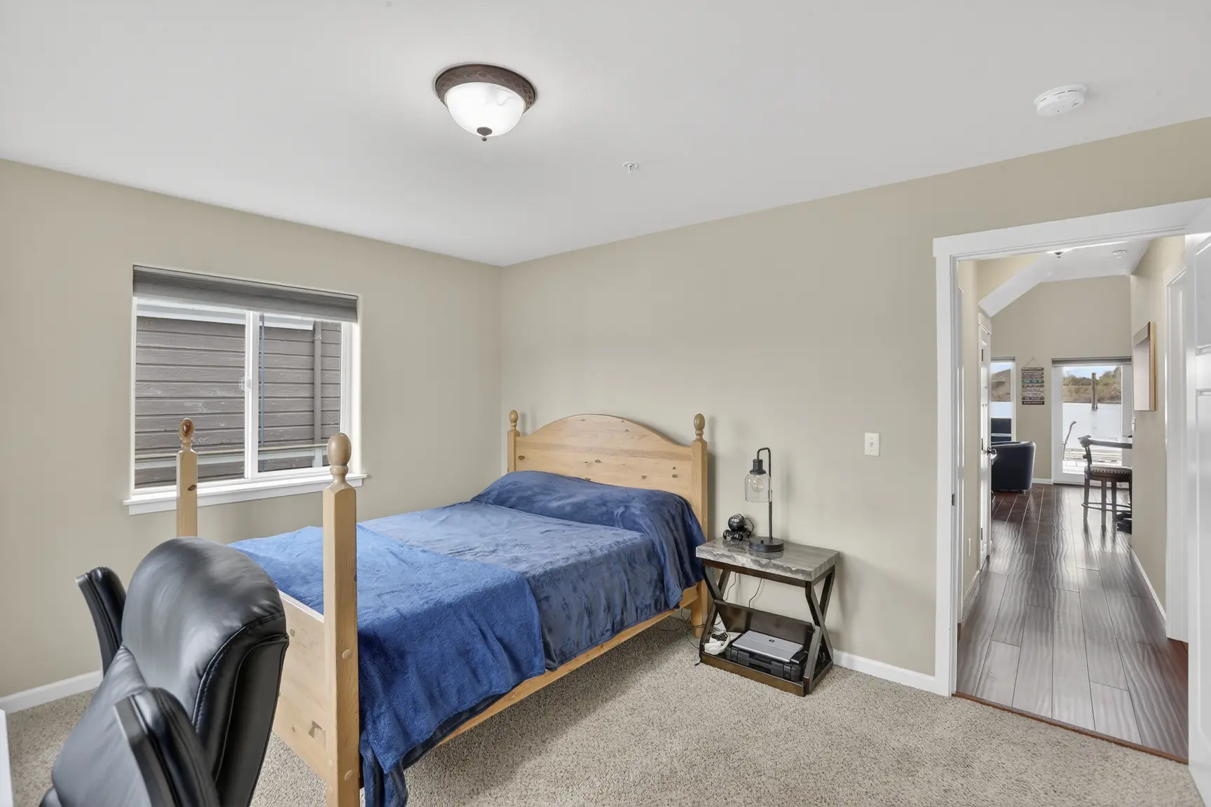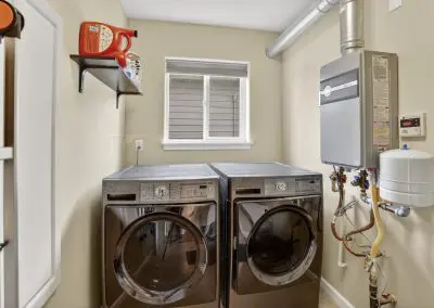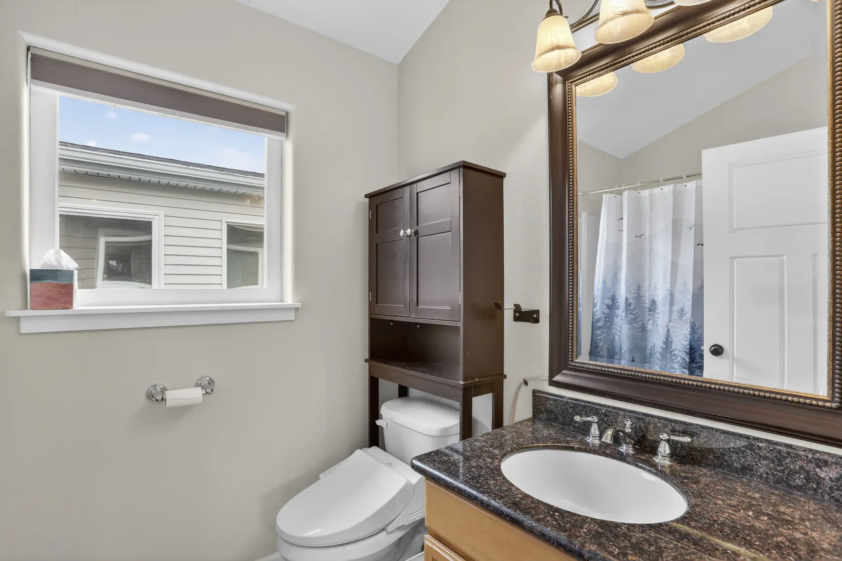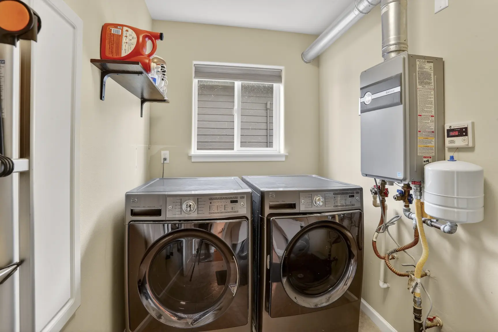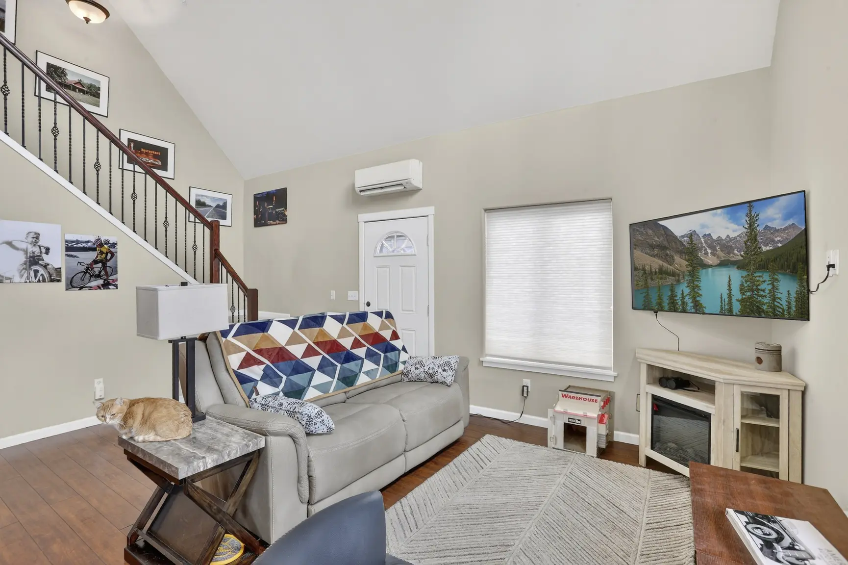 The thoughtfully designed layout includes two bedrooms and two bathrooms, with the primary suite upstairs offering privacy, vaulted ceilings, and its own flexible space perfect for a desk or reading nook. The main level also includes a spacious bedroom, full bath, and convenient utility room with washer, dryer, and tankless water heater.