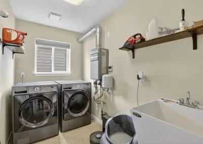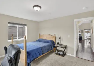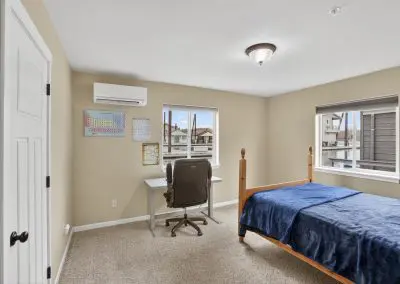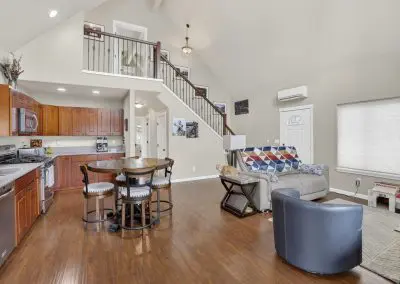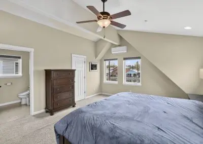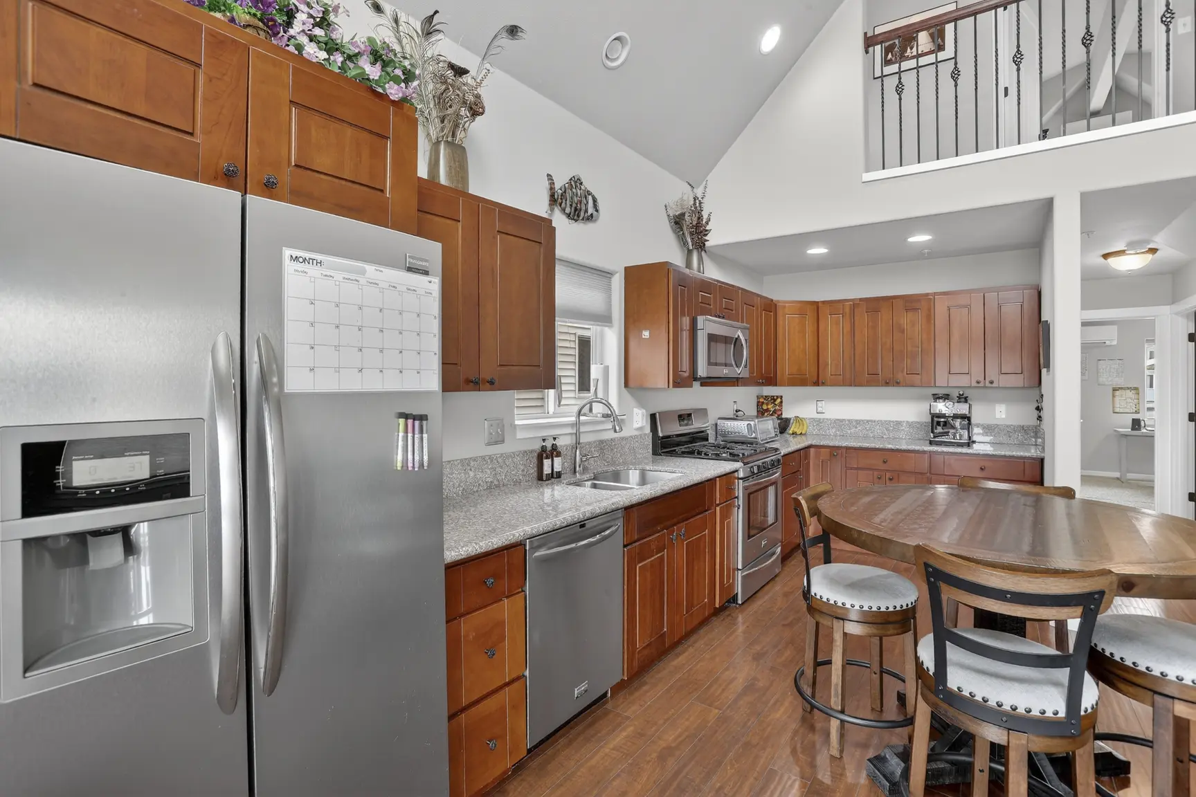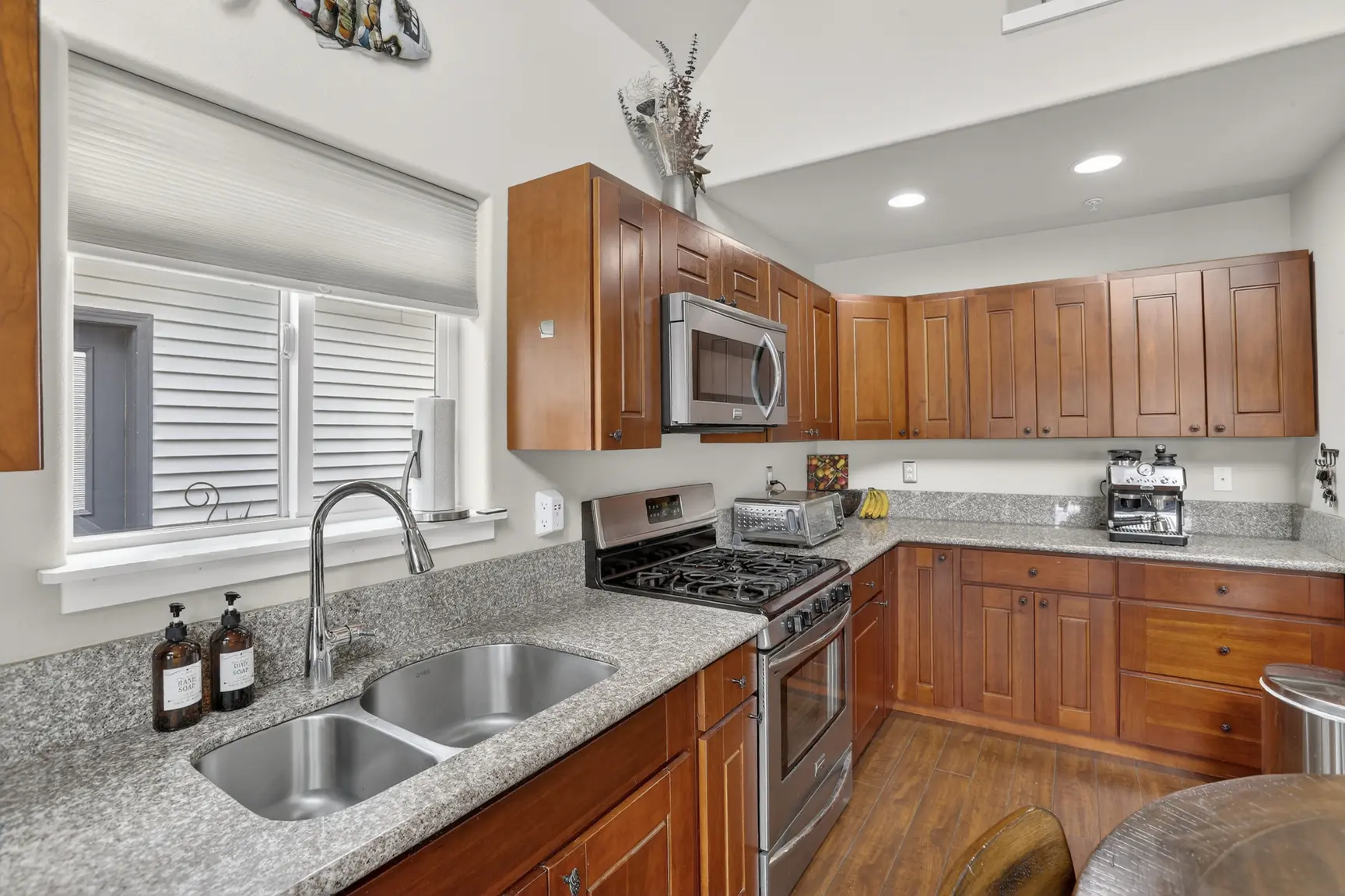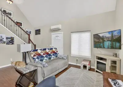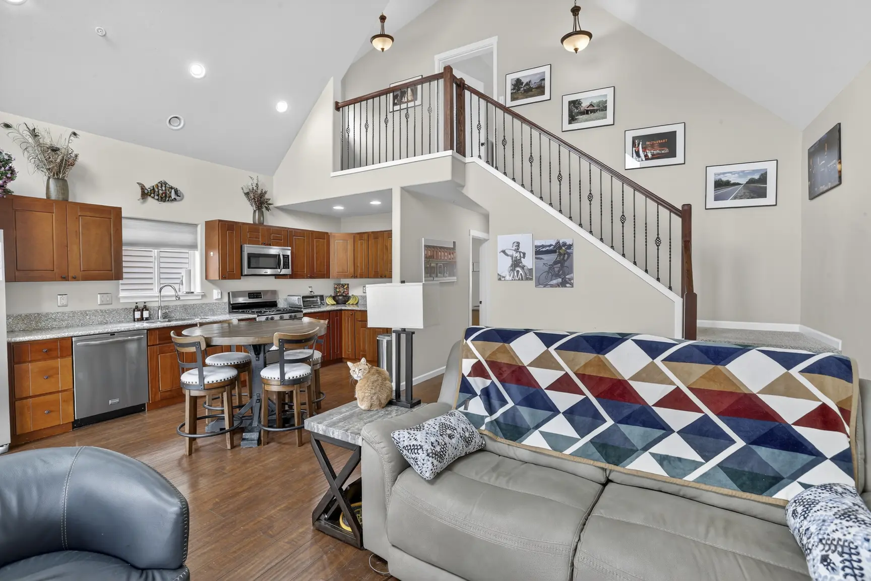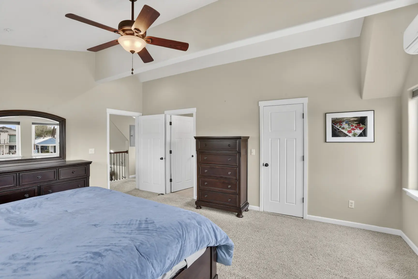 The thoughtfully designed layout includes two bedrooms and two bathrooms, with the primary suite upstairs offering privacy, vaulted ceilings, and its own flexible space perfect for a desk or reading nook. The main level also includes a spacious bedroom, full bath, and convenient utility room with washer, dryer, and tankless water heater.