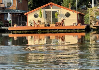 This floating home is an incredible price for Marina Way Moorage, a very sought after marina. Houses here rarely come on the market. You are in for a treat at this artist retreat. Easy living one level home with sweeping views of the Multnomah Channel, Sauvie Island, and Mt. Hood. Entering the home there is an enormous flex/mud room, a great place to hang the dog leash, drop off coats and groceries-so much storage! Next you’ll pass through the bedroom with room enough for a king size bed. Wood clad walls throughout add charm. On to the bath with clawfoot tub and skylight, across the hall is the walk in laundry room (more storage). Then, big ohhh-aaahhh, the open kitchen and living room with high wood clad ceilings, cozy wood fireplace, new French doors, quaint octagon windows, and new ceiling fan. Homeowners at Marina Way Moorage are shareholders in Marina Way and therefore they “rent” the slips from the corp. Slip rent for this house is 298/month! Just the slip alone is worth the asking price. Fix up the house and float or build new. Current house needs a new float. Pet friendly and owners get a parking space with their name on it, extra parking, and one space in the boat or RV area. It gets better, there is a boat launch too. What are you waiting for? Come soak in the sunrise of your new life on the river. CASH ONLY. No seller financing. No contingencies.