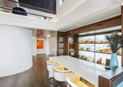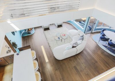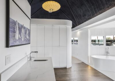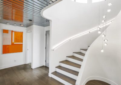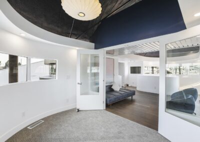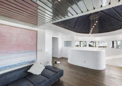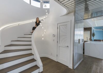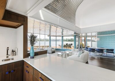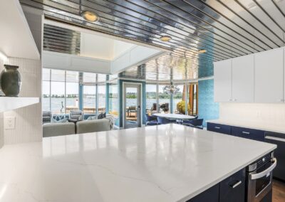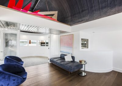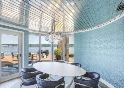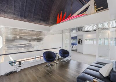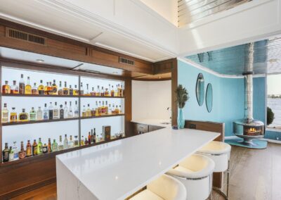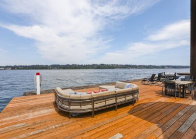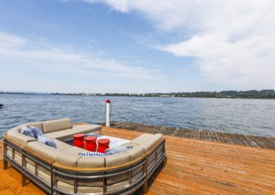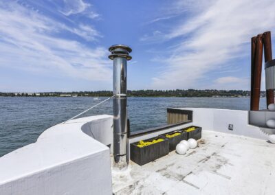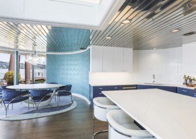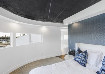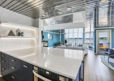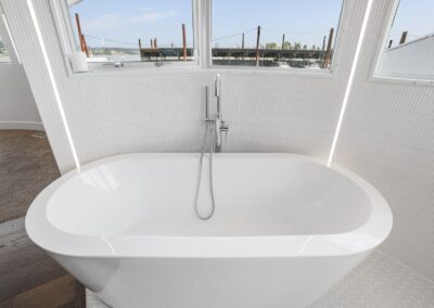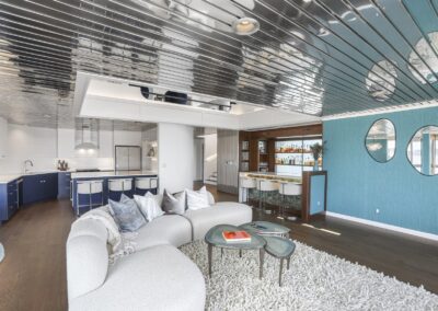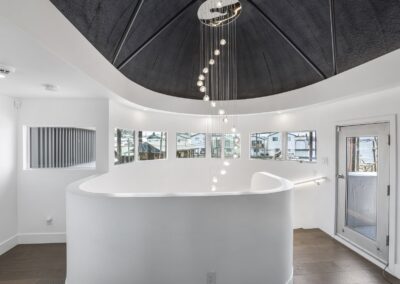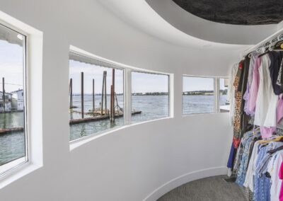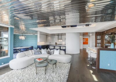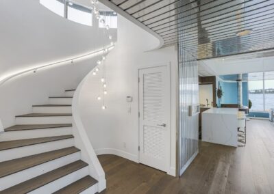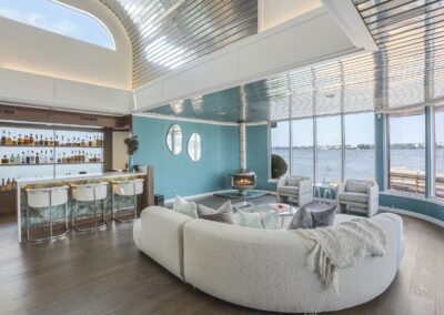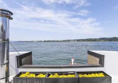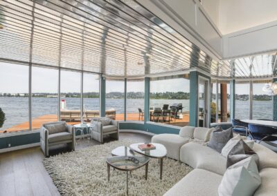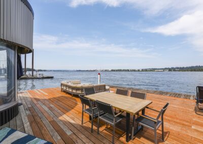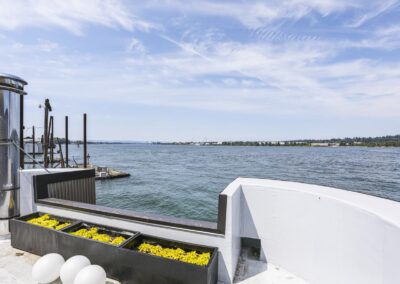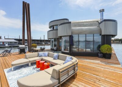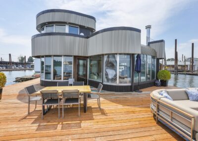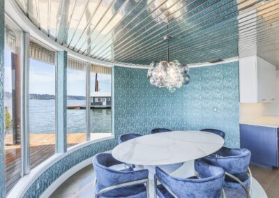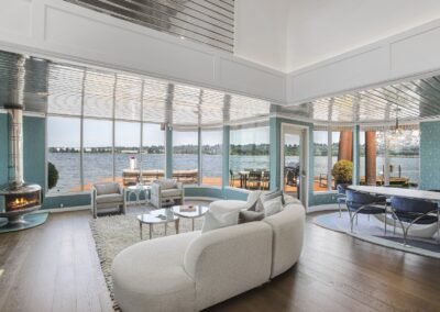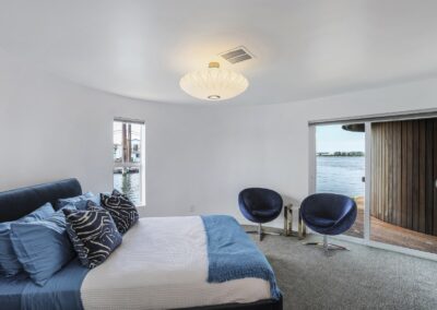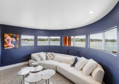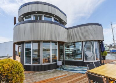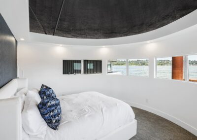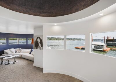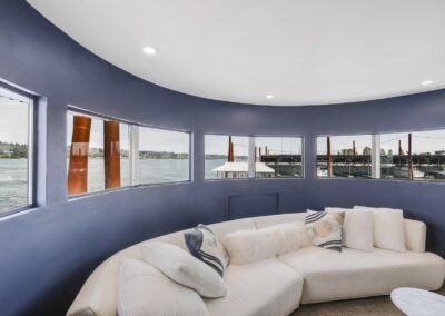 A once in a lifetime chance to own one of the most famous floating homes ever constructed in the PNW! The Aqua Star, a floating landmark since built in 1985 by visionary designer and builder Buzz Gorder, has been featured in movies and magazine articles since its construction. Reclaimed domed silos adorn the roofline, creating open interior vaulted spaces which seamlessly blend into this curvaceous floating sculpture. The current owners have meticulously brought this historic building into the 21st century thanks to their impeccable eyes for design and quality while also preserving its unique curves and design. Situated at the northernmost end of the pier in a private marina, you’ll have an unobstructed view up and down the Columbia River. Wake up with sun salutations toward Mt. Hood in the east and enjoy a beverage as the sun sets to the west. The exterior has been re-clad with powder coated metal siding; vertical lines juxtaposed with circular flowing forms that give the home its trademark look.The interior is just as stunning, with an entryway softened by vertical Mahagony accent boards and LED lighting for an impressive intro to the home. The renovation celebrates period elements; stainless steel-clad ceilings, nickel wood burning fireplace, and insulated silo roofs for starters. The grand foyer retains the original curved staircase, modernized with a backlit handrailing and a cascading chandelier. The great room greets you with floor to ceiling windows, taking in the river views, and warming with the rising of the sun. Entertainer’s dream with high end chef’s kitchen, backlit wet bar, and open dining space. A spacious bedroom with ensuite bathroom, powder room, and utility room complete the main level. The upper floor is an exquisite primary suite with sitting area, office nook, media room, bedroom, and huge bathroom with soaker tub and walk in shower. Fully furnished & simply stunning and never to be recreated!